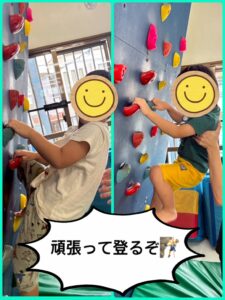 先生に支えられながら一番上を目指して掴む場所を選んでしっかり掴んだり、足を置く位置を確認しながら登りました☺️