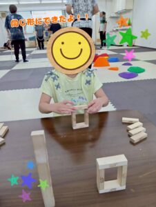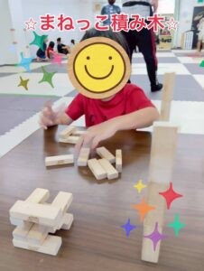職員の作った積み木の形をよく見て真剣な表情で組み立てています💪🌈