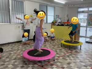トランポリンでジャンプしながら出題されたお題(ブロックの色と数)を取りに行く。ビジョントレーニングとジャンプする。 一度に2つのことを同時進行で行います!