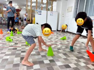 倒れている三角コーンをおこし、立っている三角コーンを倒す運動あそびです!
