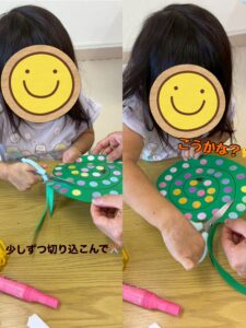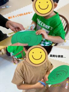 まっすぐではない曲線に合わせて画用紙を動かしたり、一気に切らずに少しずつ切り込みをいれていきます🔍