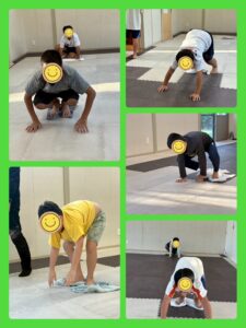 手を前にだし、体を支えて進む動きですが、手を前に固定して体のバランスを取って前に進む事がスムーズに出来ると、跳び箱の動きにも繋がってくるんです♪