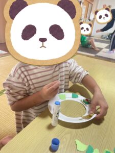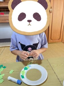 画用紙をリースの枠からはみ出さない様に気をつけながら、ゆっくりノリで貼り付けていきます😊✨