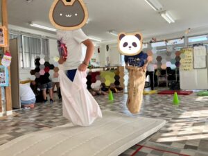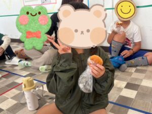 ⭐袋とびパン食い競走は、袋に両足を入れてジャンプしながら、障害物を超えパンをゲット☝️パンをゲットするのにみんな悪戦苦闘(戦い)しましたが、無事ゲットし美味しく頂きました🥳