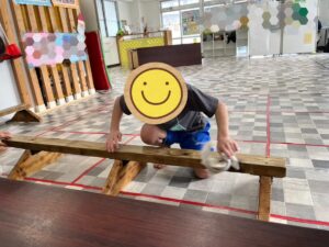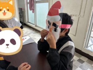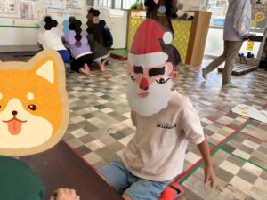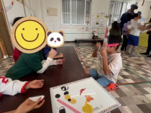 ⭐福笑いでは、サンタ🎅さんのお面をかぶり、同じチームのお友達が顔のパーツを順番に渡して、みんなで右、左など指示を出してサンタさんのお顔を完成させました(サンタクロース)