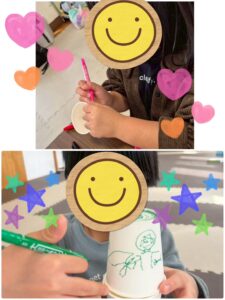 紙コップに好きな絵を描いたり、シールをペタペタ♪
