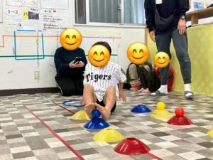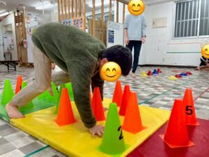 コーン移し→三角コーンの狭い隙間をクマ歩きでコーンを倒さないように集中して進みます♪