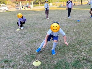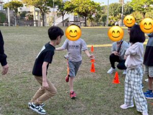 晴れた日☀️は、公園でチームに分かれ話しあい、順番を決めてコーンタッチとリレーを行いました🏃♀️