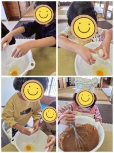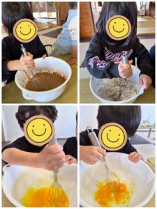 材料を順番にボウルへ入れ、交代しながら混ぜる工程では、友だちと協力する姿や、自分の順番を待つ様子が見られました👏
