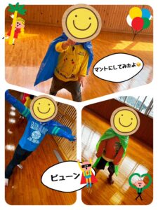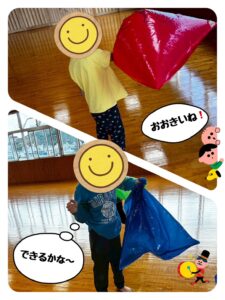 完成した作品をマントのようにして走ったり、お友達も交えて追いかけっこをしたり、空気を入れてボールを作って遊んだりと色々な遊びを楽しみましたよ✨