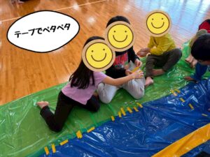 巨大シートあそびでは、カラービニール袋をテープで貼って1枚の大きなシートを協力して完成させています🌼
