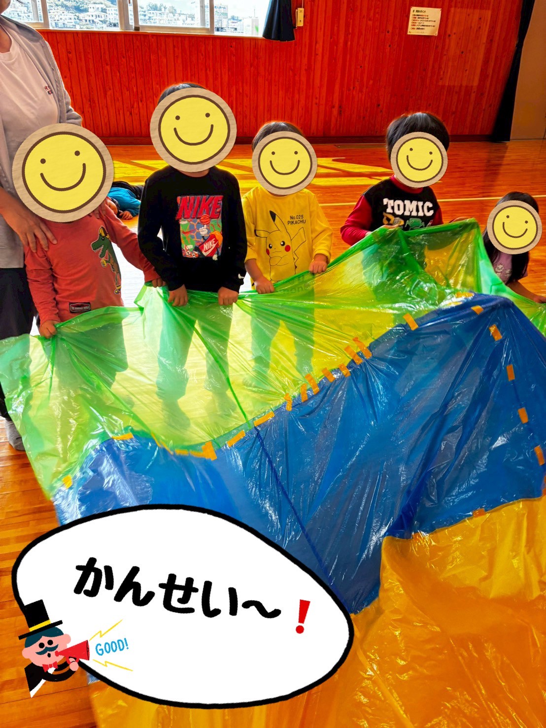 完成した巨大シートの中に入って遊んだり、シートを掴んで海の波のように見立てて動かして遊んでいます🤗