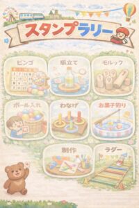 スタンプラリー形式にすることで、親子で相談しながら次の活動を考え、「できた!」が目に見える形になるよう工夫しました✨